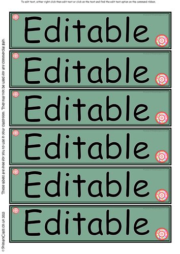 Printable Drawer & Peg Labels, book labels, editable ... Plain Editable Classroom Label Templates (SB9308) Add your own text to a variety of classroom label backgrounds with coloured borders using Microsoft Word. The labels can be resized in Word to suit your needs, and the text size and font can also be altered easily. Use these templates to create labels for drawers, pegs, resources and learning areas.
